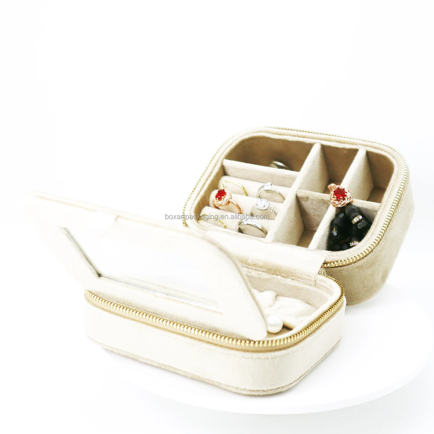 Boxart Packaging Wholesale Luxury Beige Travel Jewelry Storage Box with Mirror for Rings Earrings Necklace Jewelry Cases